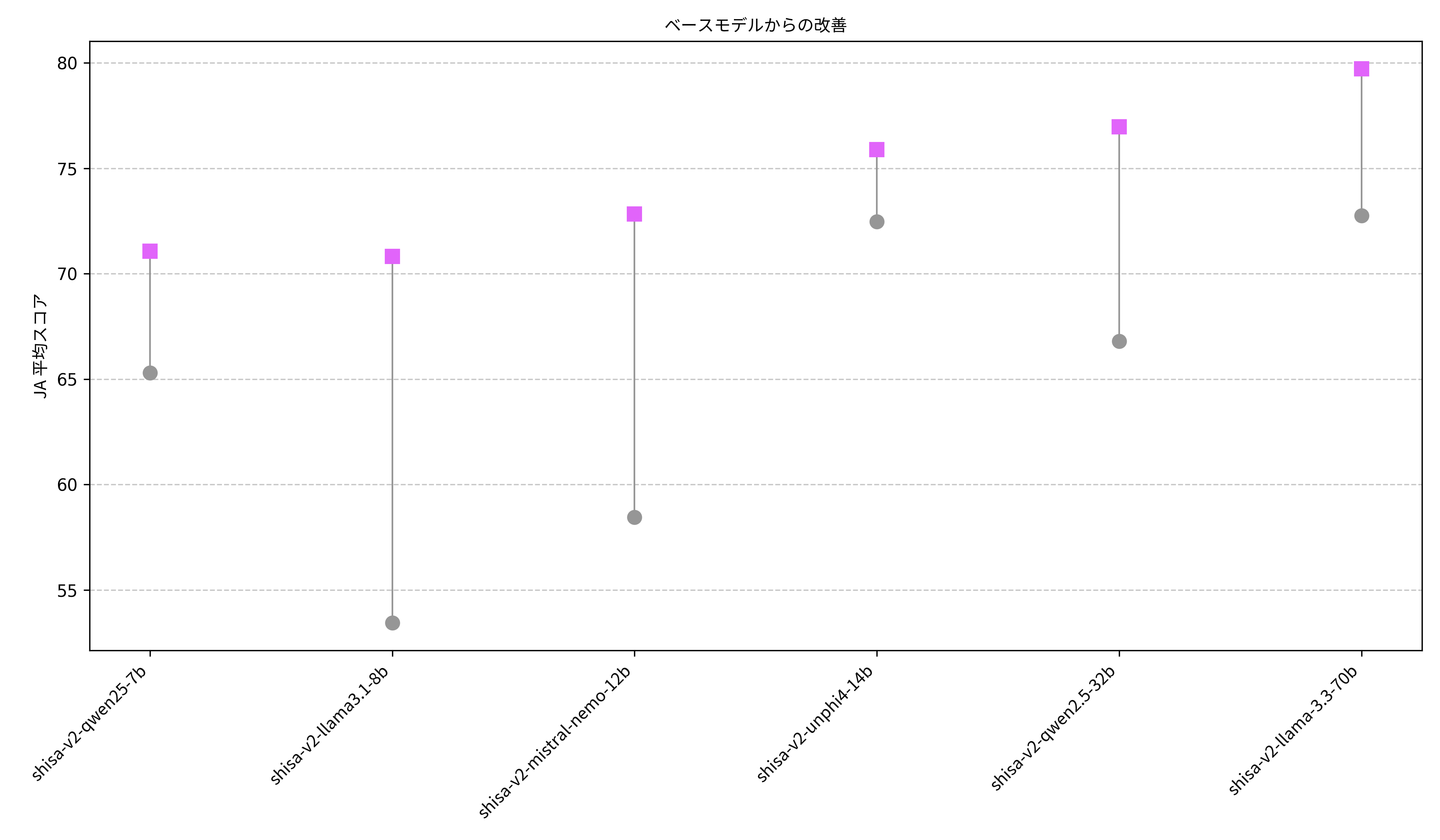 Shisa V2は、小型の7Bモデルから大型の70Bモデルまで、幅広い規模でのバージョンを公開しています。Qwen2.5やLlama3.1など各クラスのベースモデルから日本語処理能力が大幅に向上し、日常業務から専門的なタスクまで、あらゆるシーンで高い実用性を発揮します。